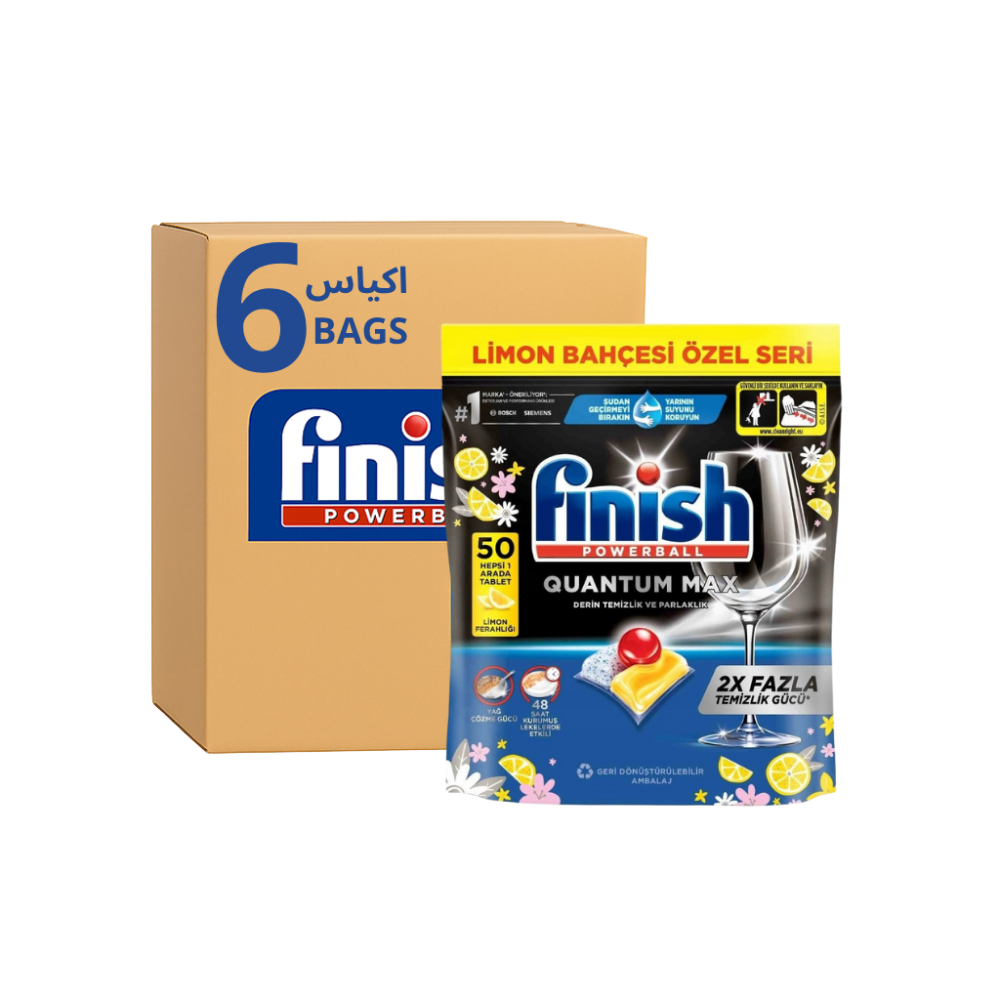 فنش كوانتم ماكس ليمون يقدم لك تنظيفًا قويًا مع رائحة الليمون المنعشة. 50 قرصًا لكل كيس، 6 أكياس. يقضي على البقع والدهون لنتائج نظيفة ولامعة.